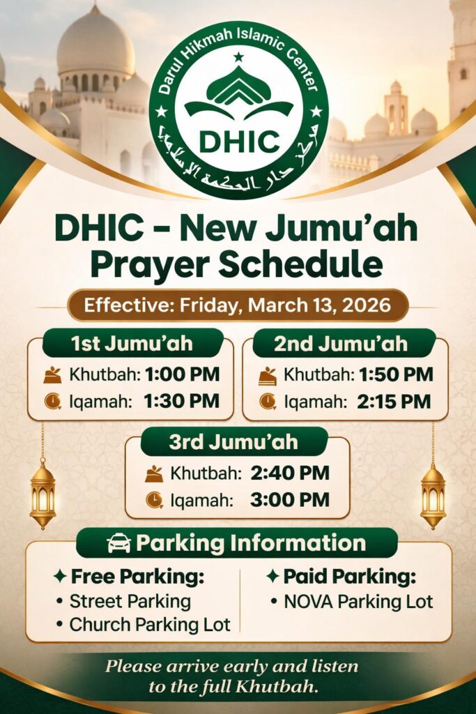 Darul Hikmah Islamic Center (DHIC) would like to invite everyone to join our fundraising event on Thursday, March 27th, 2025 after Isha prayer and before Taraweeh prayer at 5220 Fillmore Avenue, Alexandria VA 22311.